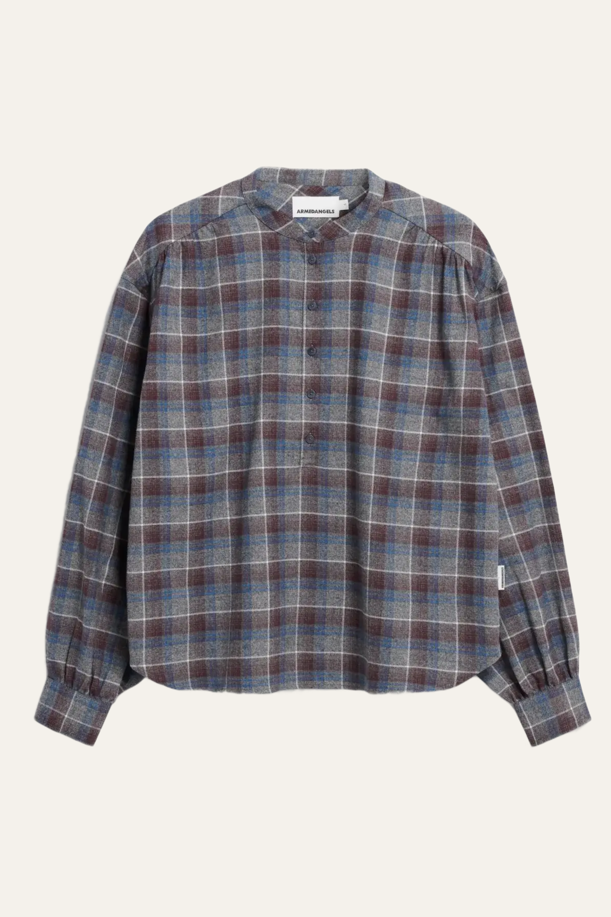 Die EFINARAA Bluse aus mittelschwerem Webstoff zeigt sich mit überschnittener Schulter, Stehkragen und feiner Raffung. Ihr gerader, lockerer Schnitt und das Karomuster verleihen eine entspannte Silhouette und zeitlosen Look.
