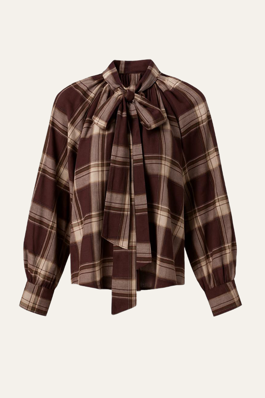 Diese Bluse kombiniert ein klassisches Karo-Muster mit einem verspielten, femininen Schnitt. Der hohe, geraffte Kragen mit eleganter Schleife verleiht dem Look eine besondere Raffinesse. Die weit geschnittenen Ärmel mit breiten Manschetten sorgen für eine moderne Silhouette und angenehmen Tragekomfort.