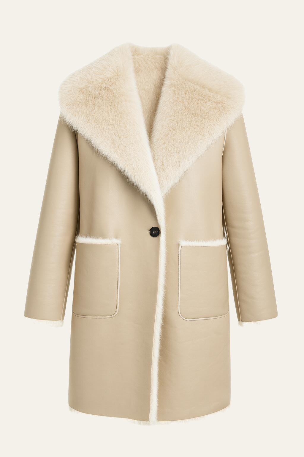 Dieser Mantel verbindet eine klare, moderne Linie mit einem angenehm weichen Tragegefühl. Das hochwertige Kunstleder hat eine glatte, leicht strukturierte Oberfläche und bildet einen schönen Kontrast zum super feinen, flauschigen Fellbesatz. Das Fell ist außergewöhnlich weich, dicht und warm und sorgt dafür, dass sich der Mantel sofort gemütlich anfühlt.