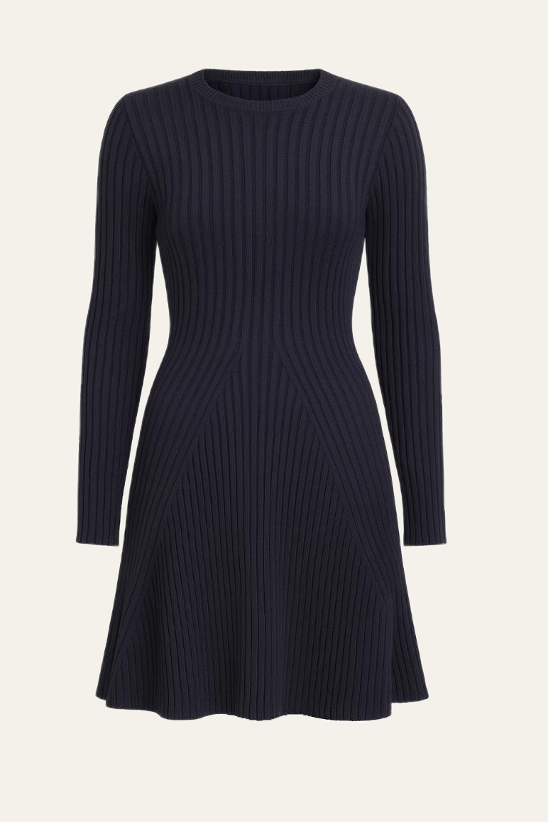 Dieses Strickkleid in tiefem Navy setzt auf eine figurbetonte Silhouette mit ausgestelltem Rockteil, die den Körper elegant umspielt. Das Rippenmuster streckt optisch und sorgt für eine moderne Struktur, während der Rundhalsausschnitt und die langen Ärmel den Look klassisch abrunden.