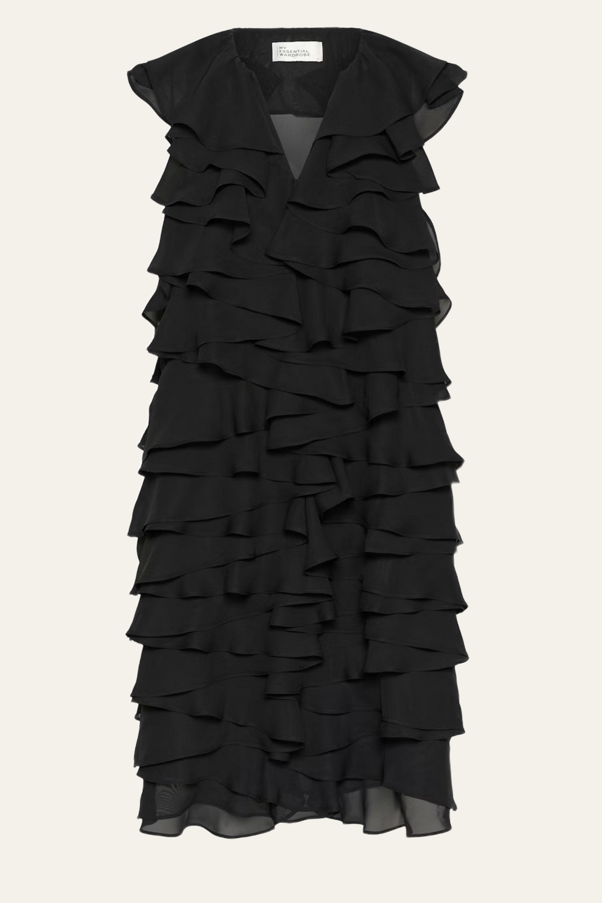 • Schwarzes Chiffonkleid mit Volants • Locker fallende, mehrlagige Rüschenoptik • Leicht transparente Schultern • Weiches, fließendes Material • Bequemer, lockerer Schnitt • Perfekt für festliche Anlässe oder Abend-Events