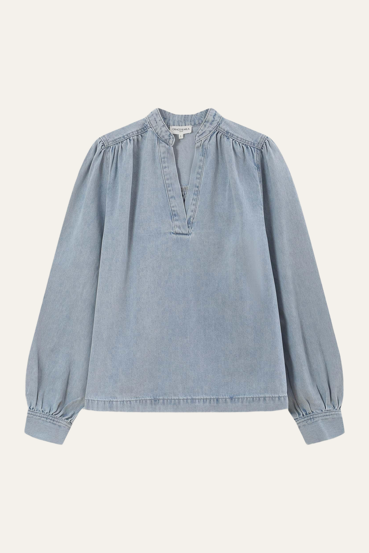 Die Bluse von Grace & Mila ist ein modernes Essential mit entspannter Pariser Leichtigkeit. Der leichte Denim-Look in sanftem Hellblau verleiht dem Modell eine ruhige, hochwertige Ausstrahlung, während der lockere Schnitt und die feinen Raffungen an der Schulter für eine fließende, feminine Silhouette sorgen. Der schlichte Stehkragen mit V-Ausschnitt trifft auf sanftes Volumen und macht die Bluse zum perfekten Mix aus casual und chic.