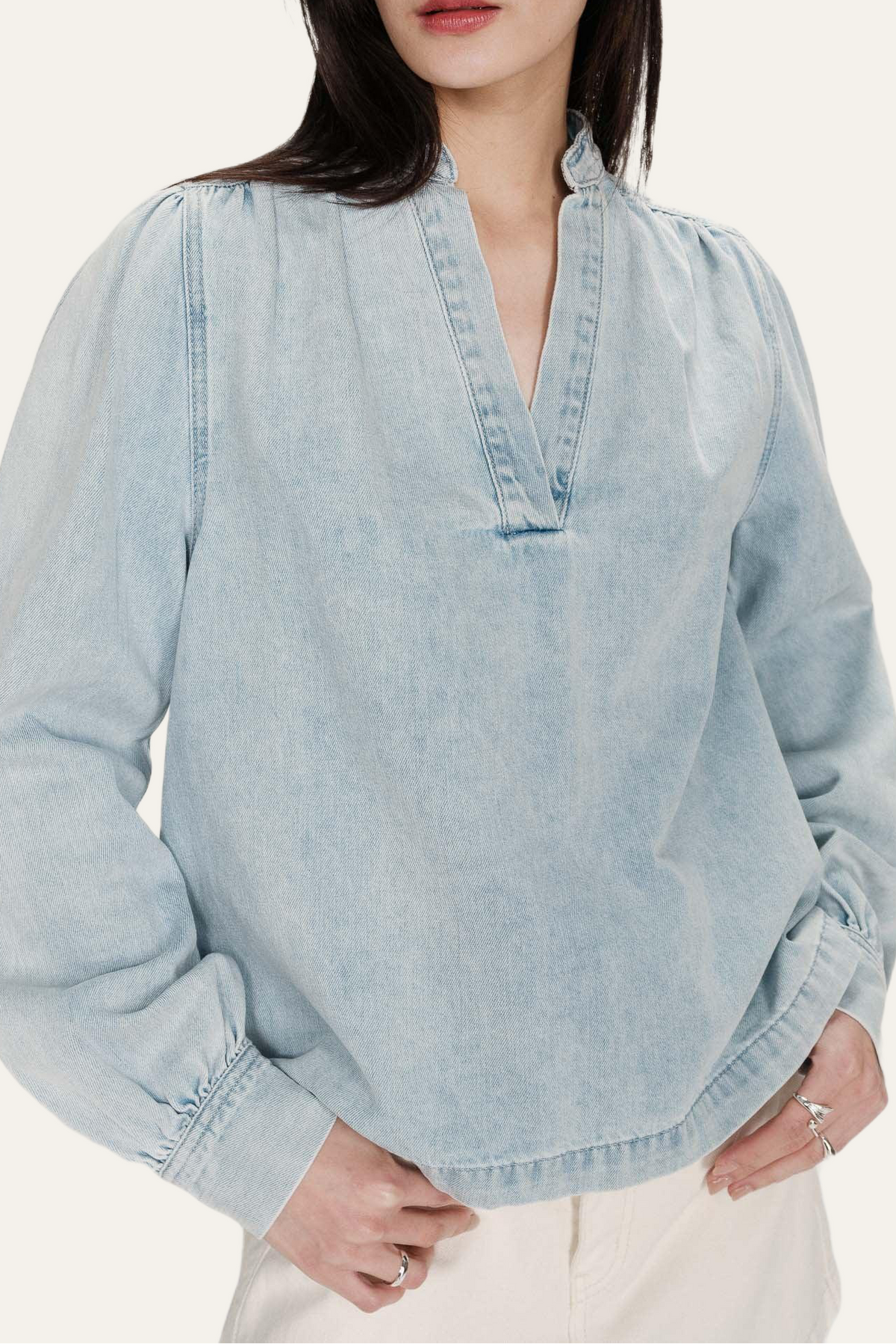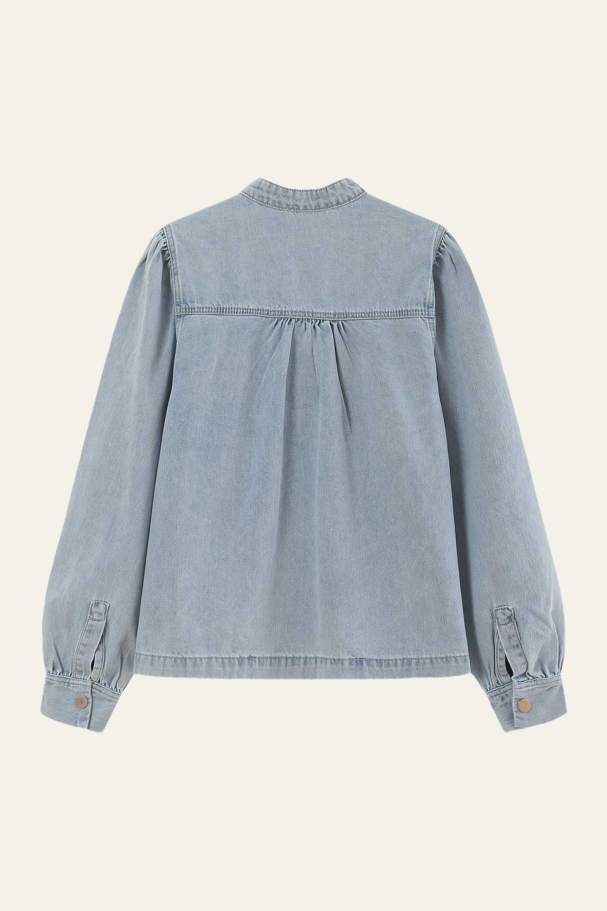 • Leichter Denim-Look • Lockerer, fließender Schnitt • Stehkragen mit V-Ausschnitt • Dezente Raffungen im Schulterbereich • Lange Ärmel mit Manschetten • Weich fallender, angenehmer Stoff
