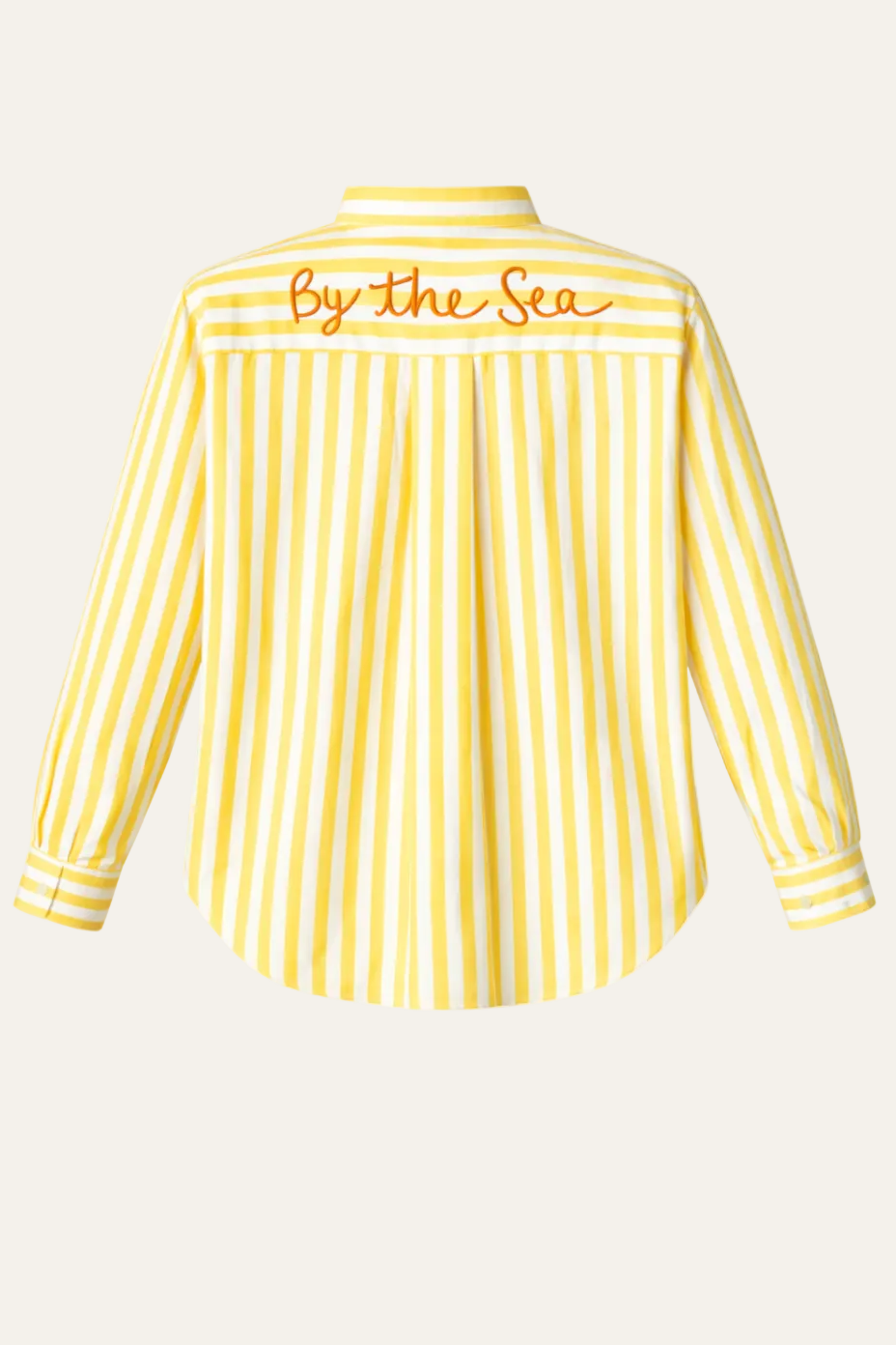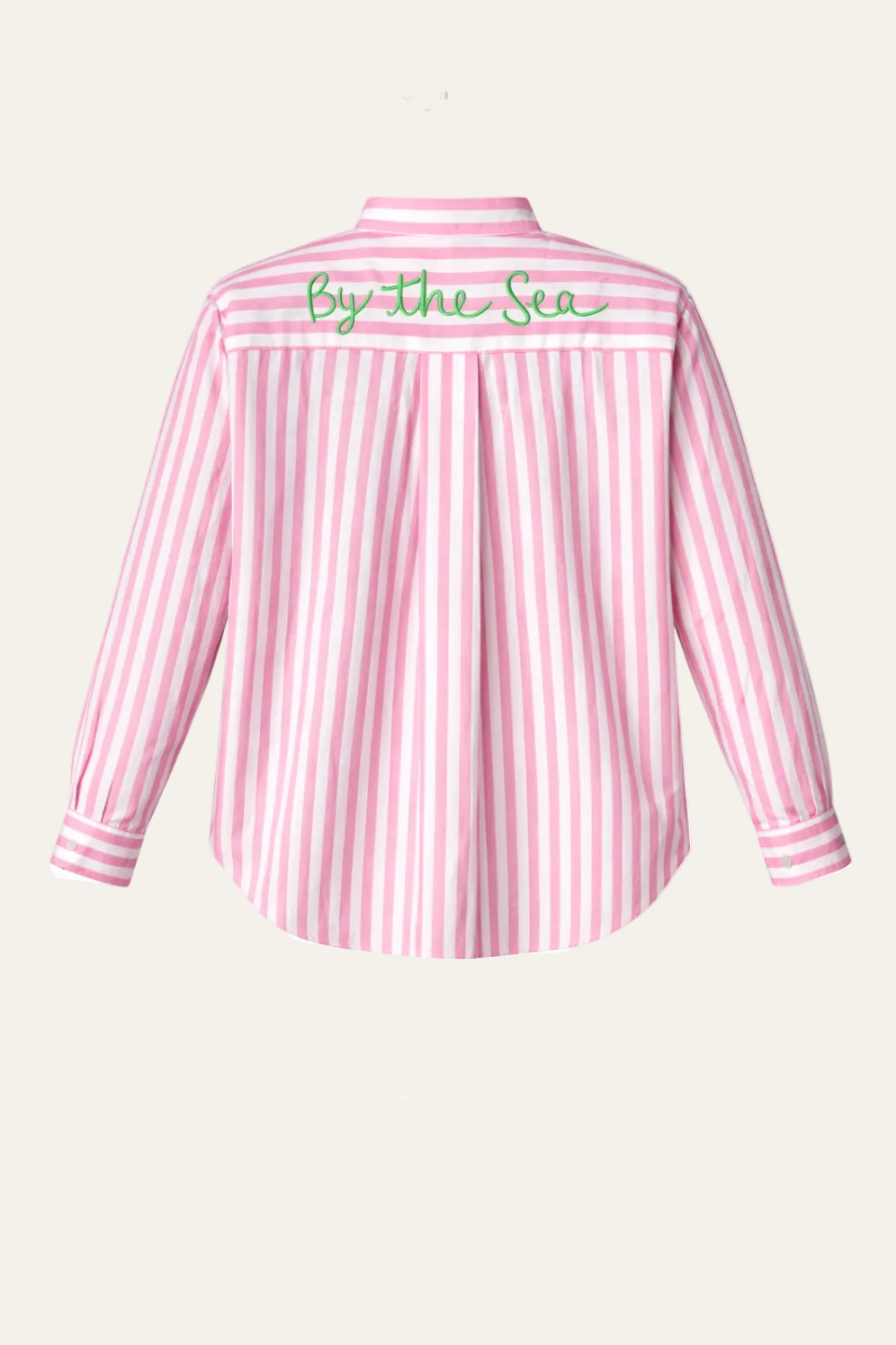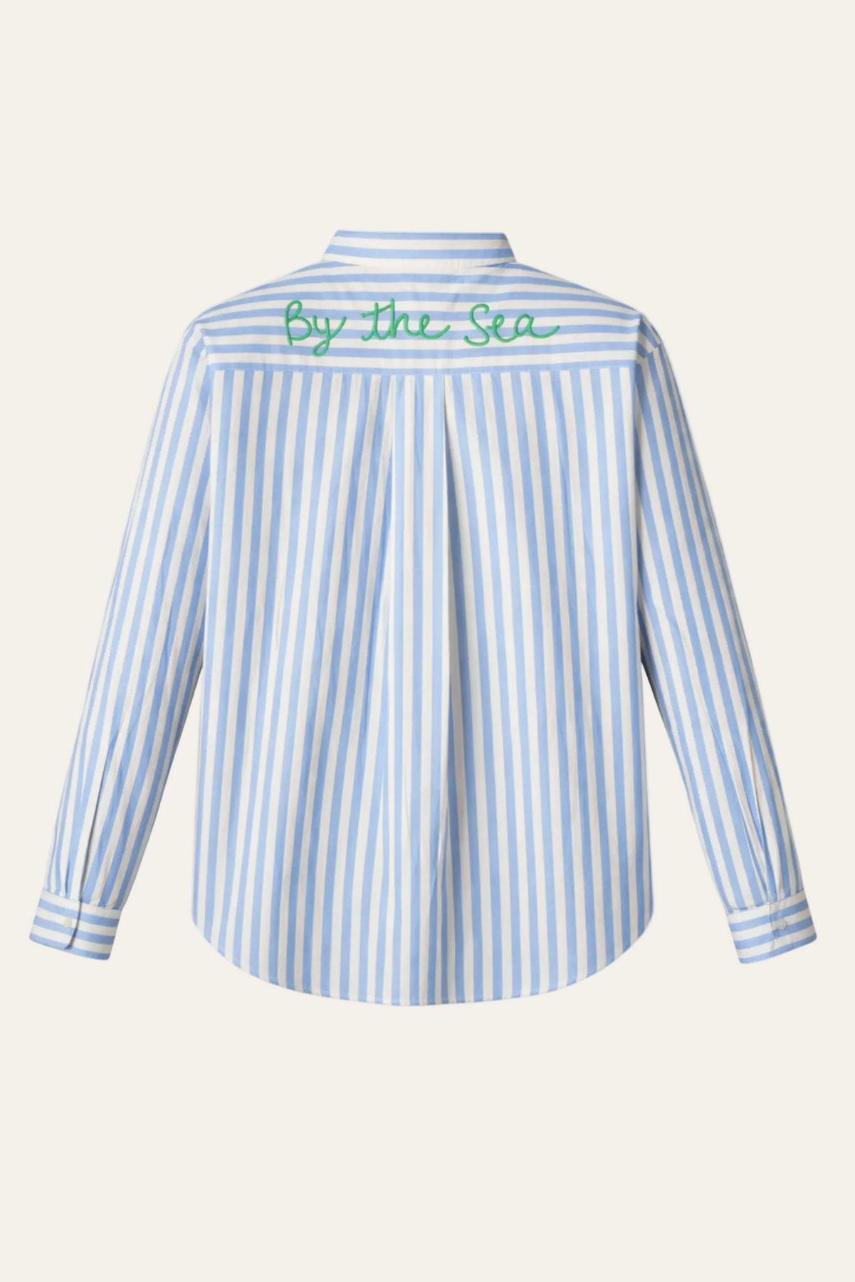 Die feinen Streifen in Blau Weiß, Rosa Weiß oder Gelb Weiß wirken frisch und zeitlos, während der lockere Schnitt für eine entspannte Silhouette sorgt. Auf der Rückseite setzt die grüne „By the Sea“ Stickerei ein besonderes Highlight und verleiht der Bluse ihren individuellen Charakter.