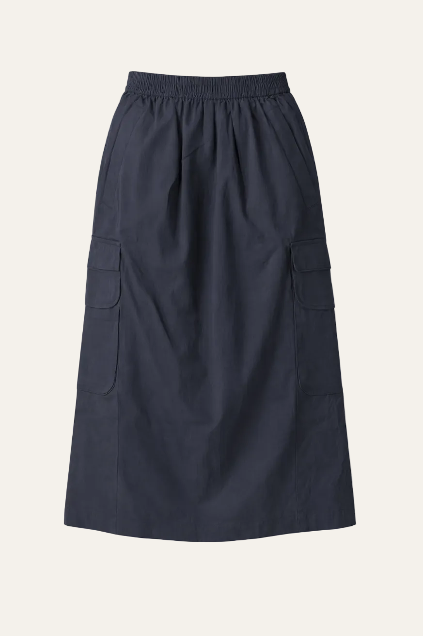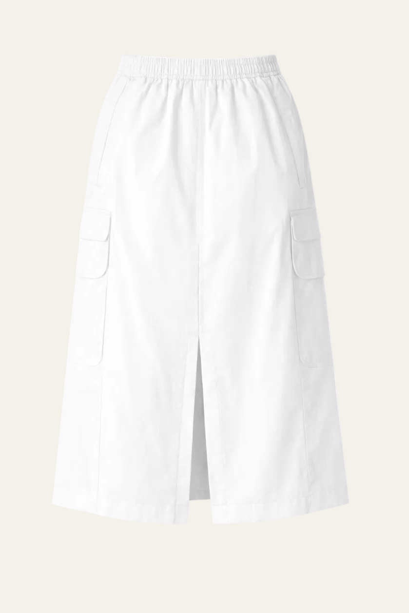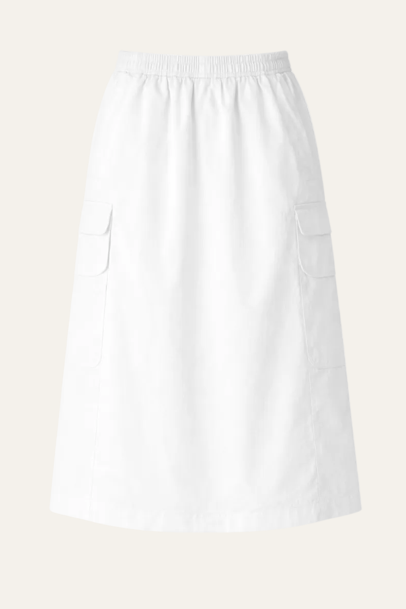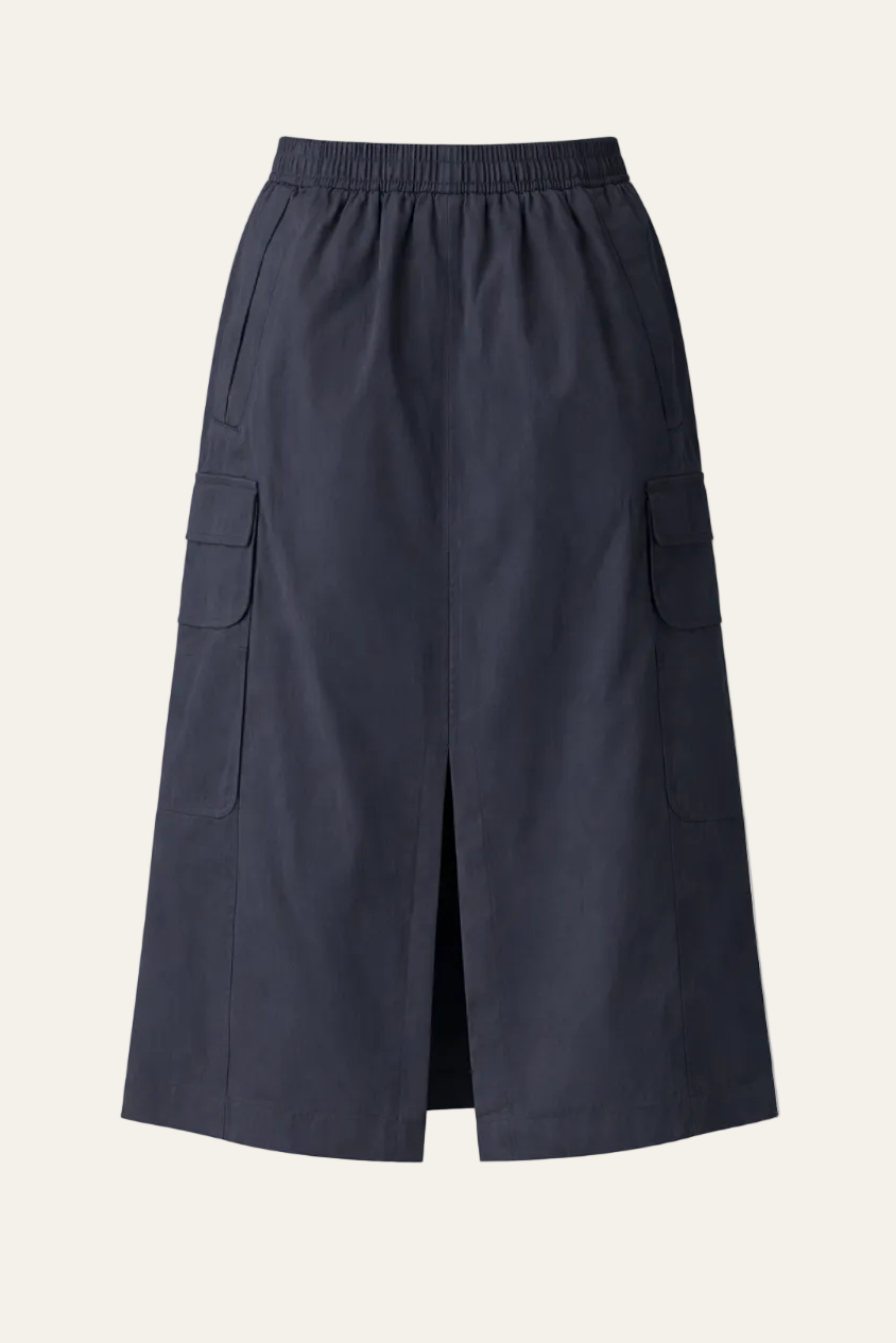 Der Cargo Rock überzeugt mit seiner klaren Linienführung und einer entspannten A-Linie. Der elastische Bund sorgt für einen bequemen Sitz und macht den Rock angenehm unkompliziert im Alltag. Die aufgesetzten Cargotaschen verleihen dem Look eine moderne, urbane Note und setzen einen schönen Kontrast zur leichten, fließenden Qualität des Materials. Der rückseitige Schlitz sorgt für Bewegungsfreiheit und einen entspannten Fall.