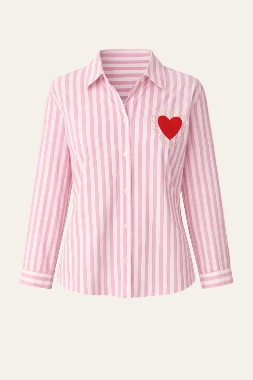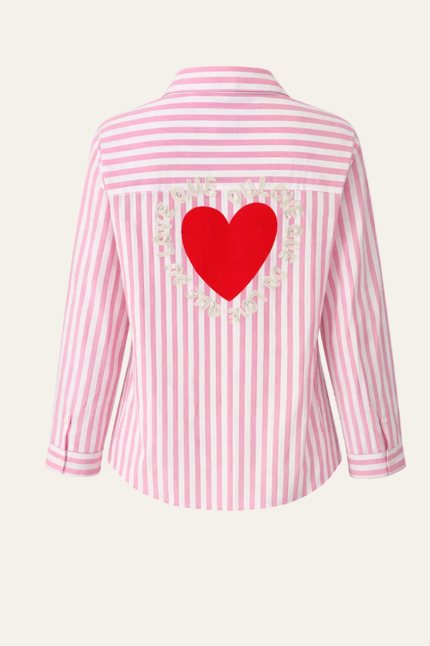 Diese gestreifte Bluse in Rosa und Weiß bringt sofort gute Laune in den Look. Der klassische Hemdkragen und die durchgehende Knopfleiste treffen auf ein modernes, leicht verkürztes Design. Besonderes Highlight ist die große Herz Stickerei mit liebevollem Schriftzug, die vorne und hinten ein echtes Statement setzt.